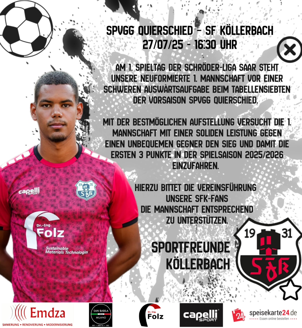 SpVgg Quierschied. Mit der bestmöglichen Aufstellung versucht die 1. Mannschaft mit einer soliden Leistung gegen einen unbequemen Gegner den Sieg und damit die ersten 3 Punkte in der Spielsaison 2025/2026 einzufahren. Hierzu bittet die Vereinsführung unsere SFK-Fans die Mannschaft entsprechend zu unterstützen.